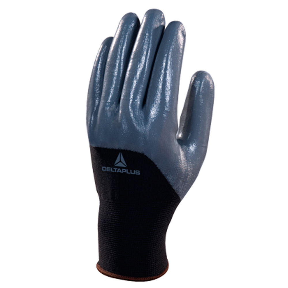 Luva de poliéster com banho 3/4 nitrílica na palma e ponta dos dedos.