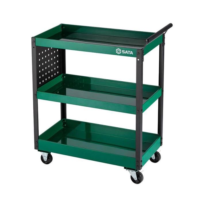 Chegou o Carro para Ferramentas de 3 Níveis SATA - ST95222B pronto para elevar a produtividade e versatilidade dos mecânicos automotivos e industriais. Suas laterais contam com painéis perfurados para personalização com acessórios diversos.O carrinho possui uma estrutura robusta, feita inteiramente de chapas de aço de 1,2 mm, proporcionando máxima resistência e suportando até 80 kg de carga estática. Sua pintura eletroestática garante durabilidade, assegurando uma vida útil prolongada.Seus rodízios de 3 contam com rodas em Poliuretano, sendo duas rodas fixas e duas rodas giratórias de 360º com freios superiores, suportando serviços mais pesados com mais segurança e mobilidade.Possui três bandejas, garantindo a proteção das ferramentas contra quedas durante o transporte. Também possui um puxador ergonômico que facilita o transporte.