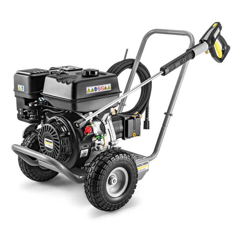 Lavadora de alta pressão com água fria e motor a gasolina. Se destaca por sua fonte de alimentação autossuficiente e pressão de trabalho de até 250 bar.
