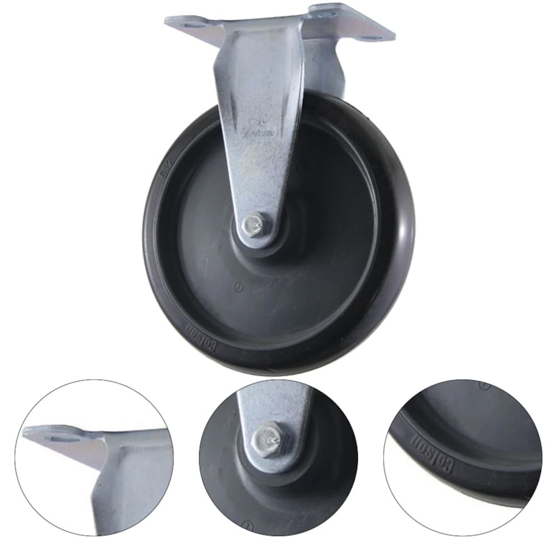 Roda: Banda em borracha termoplástica ? PVC (cinza), núcleo em polipropileno, furo passante (cinza). Dureza 75 Shore A (-10°C a 50°C).